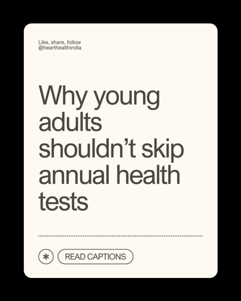 In India, most people in their 20s and 30s assume health tests are “for older people.”But biologically, this is the exact age when silent risk begins.By the time symptoms appear in the late 30s or 40s, the underlying changes have already been building for years. Here’s why early testing is essential — especially for young professionals. 1. Early plaque formation starts decades before symptoms Atherosclerosis doesn’t begin at 50.Fat streaks in arteries can start in the late teens.LDL and Lp(a)-driven plaque quietly progresses without any warning signs.Annual tests catch this long before it becomes dangerous. 2. Modern lifestyles accelerate risk in the 20s and 30s Long sitting, stress, skipped meals, late nights, high-salt foods, and fast-paced work culture create metabolic strain early.These habits elevate BP, LDL, and triglycerides — silently. You may feel energetic, but your numbers may tell a different story. 3. Genetics don’t show up in how you look or feel High Lp(a), familial high cholesterol, and early hypertension run in families but show no symptoms.Only a test can reveal them.Young adults with normal stamina and fitness levels can still carry significant inherited risk. 4. Young heart attacks in India are rising India sees heart events a decade earlier than Western countries.Missing annual tests means missing the window where simple lifestyle changes or early medication could fully prevent an emergency. 5. Early detection = easier prevention When risks are caught early, small corrections in diet, sleep, movement, stress, and medication (if needed) can reverse the trajectory completely. Waiting too long means the heart has already absorbed years of silent damage. The principle Annual tests aren’t a sign of fear.They’re a sign of responsibility — catching risk early, before life gets interrupted.