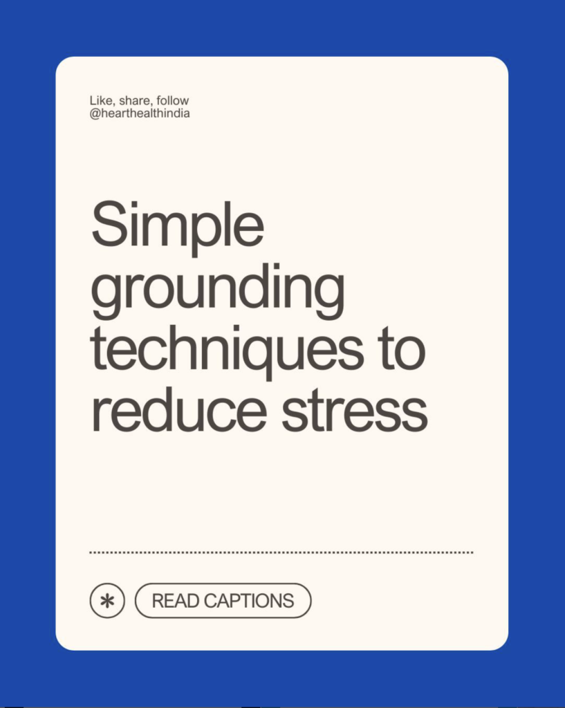 When your mind races and your body feels tense, grounding techniques act like a reset button for the nervous system.They pull you out of “fight or flight” and bring the body back into a calmer, more stable state — something your heart benefits from immediately. Here’s how grounding works physiologically and how to practice it daily. 1. Slow exhalation breathing Long, slow exhales activate the vagus nerve — the body’s natural relaxation switch.Try 4 seconds inhale, 6–8 seconds exhale.Within minutes, heart rate slows, BP stabilizes, and the chest feels lighter. 2. The 5-4-3-2-1 sensory method Identify: 5 things you can see 4 you can touch 3 you can hear 2 you can smell 1 you can tasteThis shifts attention from internal panic to external reality, calming the brain’s threat response. 3. Grounding through touch Place your feet flat on the floor, sit upright, and feel the weight of your body.This anchors the nervous system, reduces adrenaline, and brings immediate physiological stability. 4. Temperature reset Splash cold water on your face or hold something cool for 10–15 seconds.Cold triggers the “dive reflex,” which naturally slows heart rate and reduces stress signals. 5. Guided grounding phrases Use simple self-talk like:“I am safe.”“This sensation will pass.”“I can slow my breathing.”Words redirect the brain away from spiraling thoughts. The principle Grounding doesn’t eliminate stress — it lowers the body’s reaction to it.A calmer nervous system means a calmer heart.